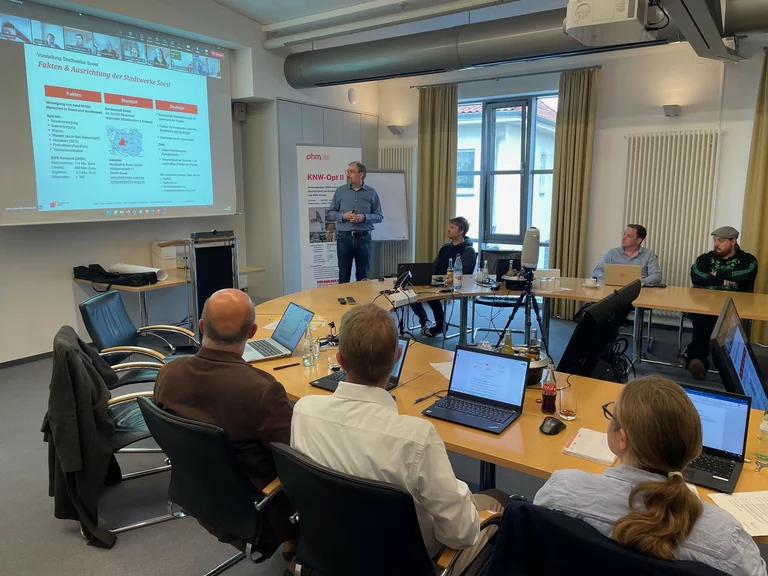 Am 17. Mai 2025 fiel der Startschuss für das neue Forschungsprojekt KNW-Opt II. Das Kick-Off-Treffen fand in den Räumlichkeiten der Stadtwerke Soest statt – einem der zentralen Praxispartner im Projekt. Das Vorhaben konnte dank der effizienten Zusammenarbeit aller Beteiligten bereits wenige Monate nach der Antragstellung bewilligt und gestartet werden. Im Rahmen des Kick-Offs nutzten die Projektpartner die Gelegenheit für eine Begehung des Baugebiets in Soest. Gemeinsam mit dem Projektträger Jülich wurden zudem die nächsten Arbeitsschritte abgestimmt.
